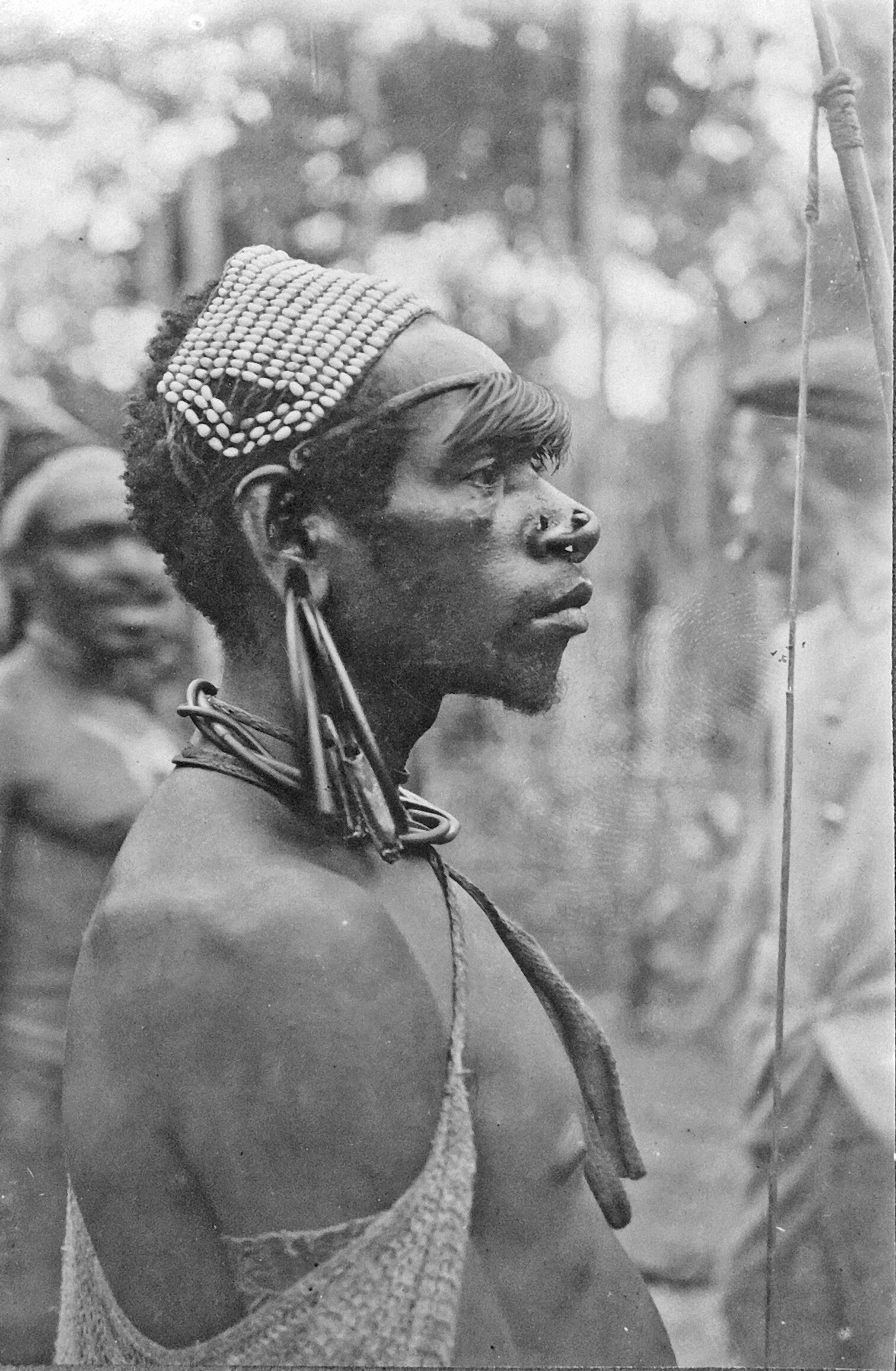 Portret van een jonge man van Boven-Digoel met diadeem van Coix pitten en een borstsieraad van varkenstanden. Afdruk Pater P. Vertenten 1924-1932