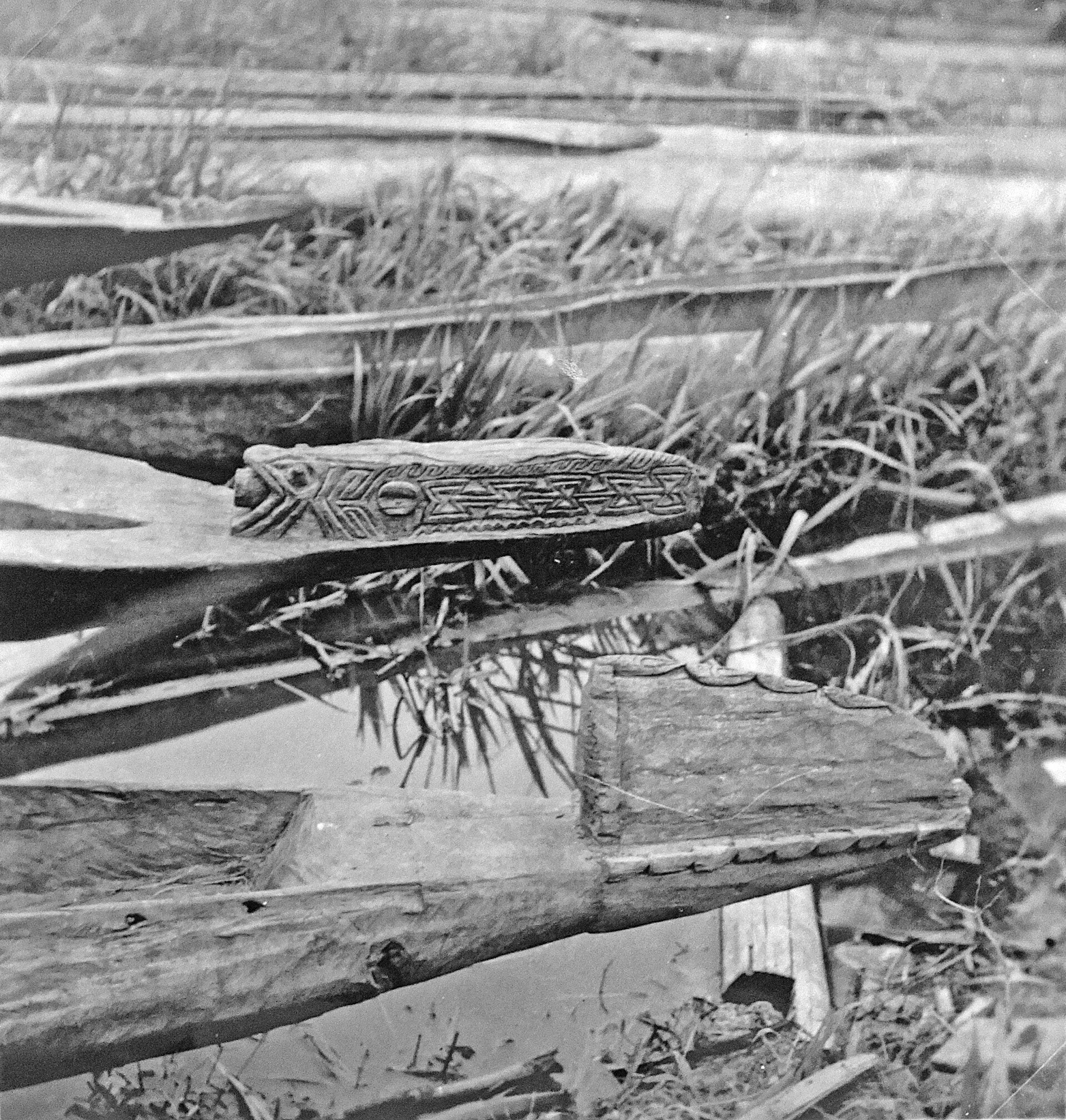 AR-P027 20167-35 Deel van de bisjpaal hier op de grond liggend tegen de bamboelatten met nipah- of rumbiabladeren die als dakbedekking dienst doen